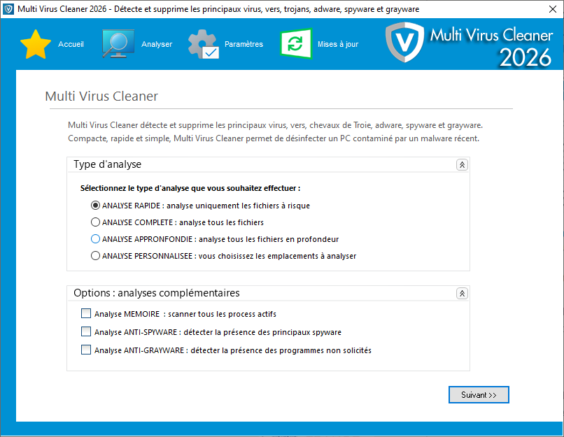 Multi Virus Cleaner utilise la technologie française VirusKeeper. Multi Virus Cleaner est un outil de désinfection, ce n'est pas un antivirus. Pour protéger votre ordinateur contre les différentes formes de menaces actuelles, installez la solution antivirus/antimalware VirusKeeper Ultimate.