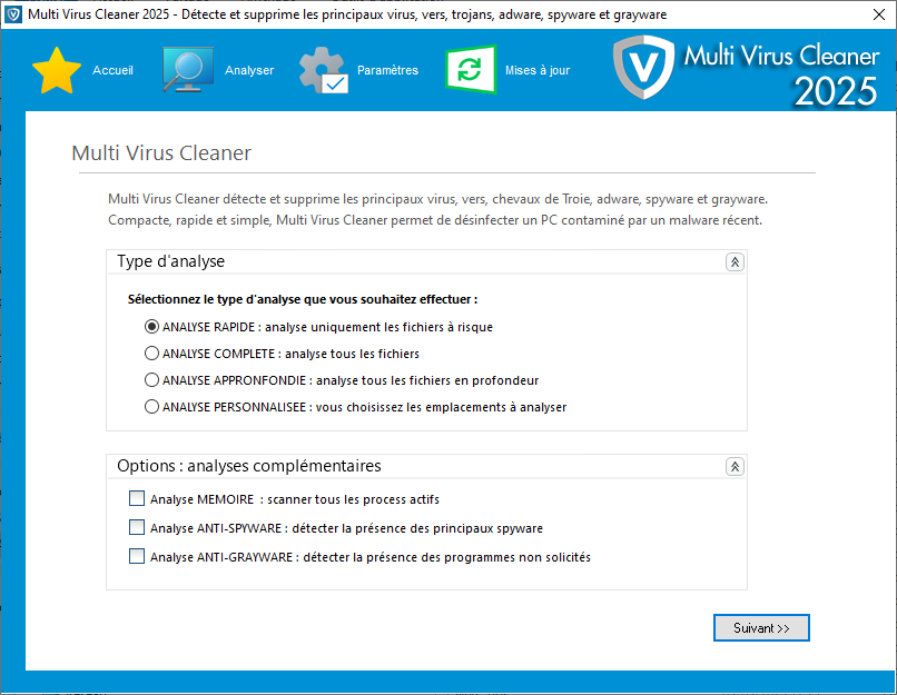 Multi Virus Cleaner utilise la technologie française VirusKeeper. Multi Virus Cleaner est un outil de désinfection, ce n'est pas un antivirus. Pour protéger votre ordinateur contre les différentes formes de menaces actuelles, installez la solution antivirus/antimalware VirusKeeper Ultimate.